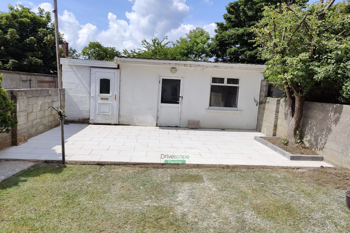 Drivescape Paving installed a new patio in Killester Avenue, Dublin, featuring 600 by 400 mm Newgrange silver granite slabs and charcoal kerbing around the flowerbeds.